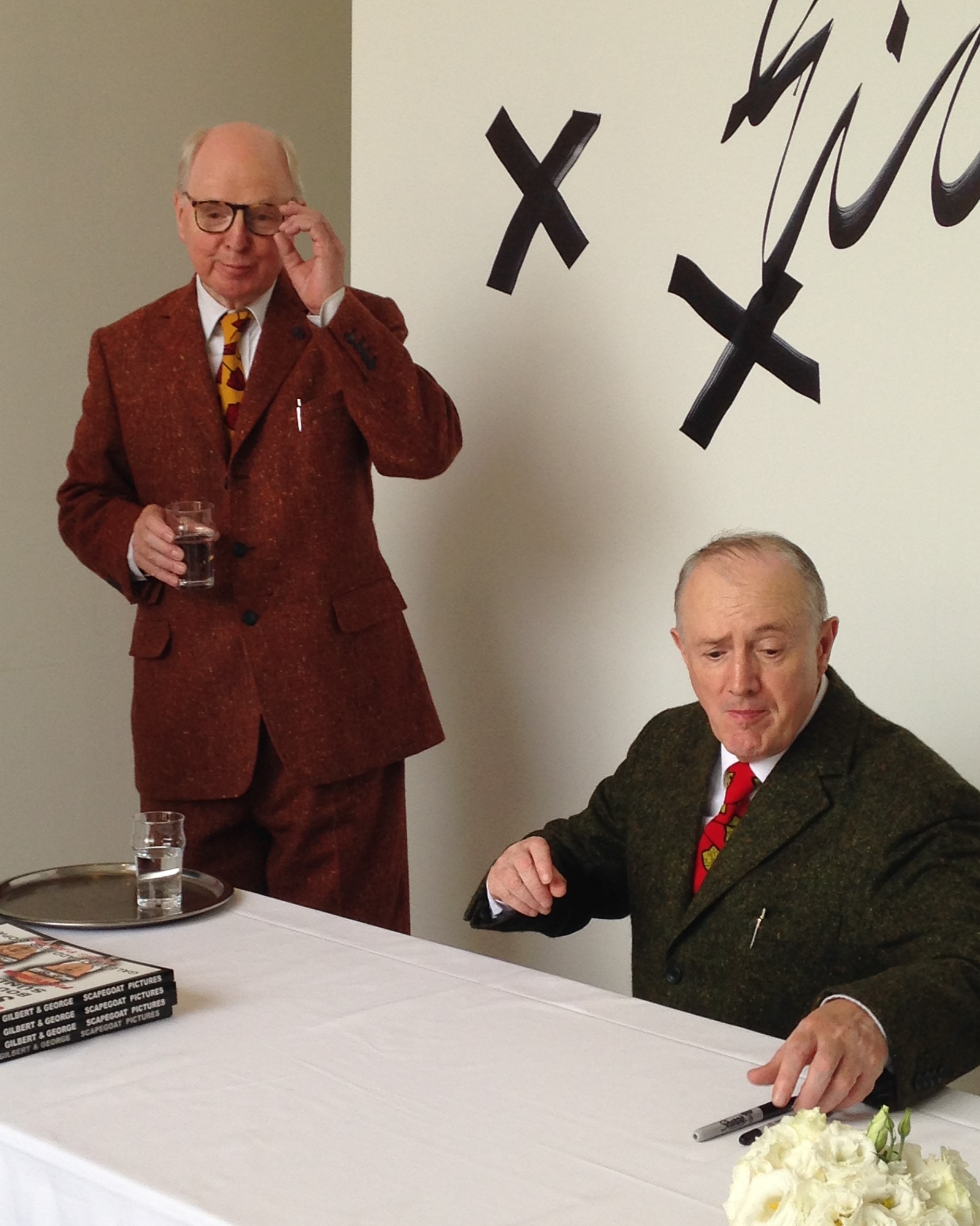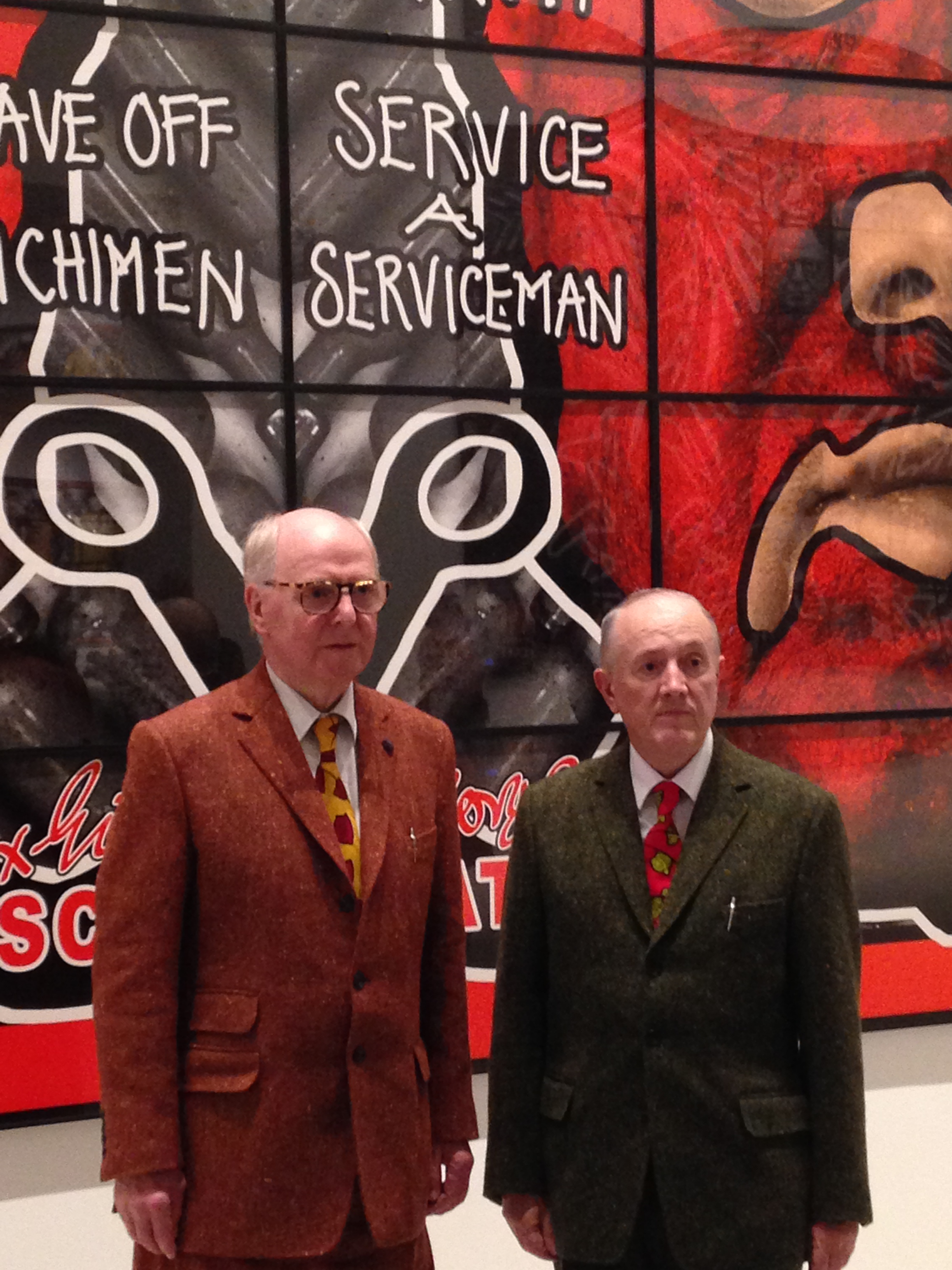 Gilbert& George dont la notoriété internationale s’est imposée depuis leur début en 1969 à travers un geste artistique singulier, en effet les deux artistes britanniques vivent leur pratique de « sculpture vivante », pour témoigner des mutations de leur environnement londonien.
