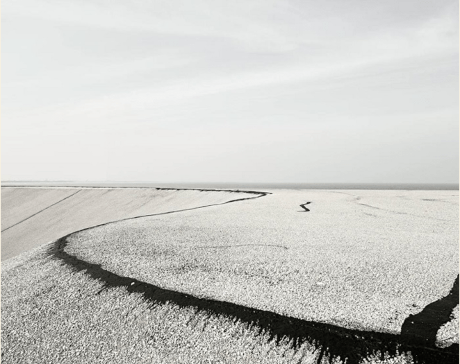 Les tirages exposés ont un modelé et une finesse qui restituent les textures d’un paysage dont la vacuité des constructions condamnées à se déliter s’éploie face à une mer et des ciels insondables.