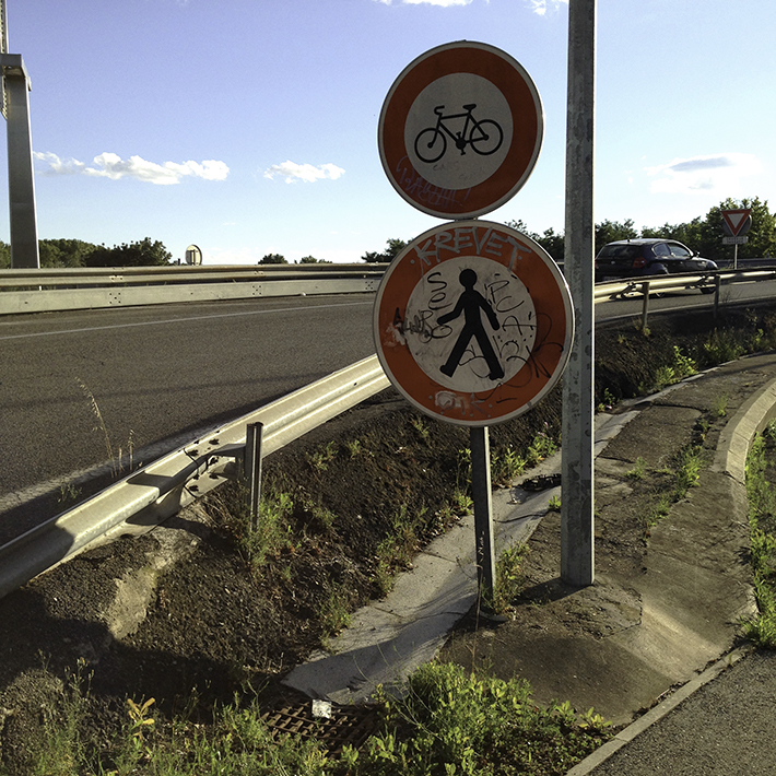 Un parcours simple et facile, d’environ une heure et demie, qui part de la Fondation Luma, descend le long de la voie ferrée désaffectée, passe au-dessus de l’autoroute et ensuite longe les rives du canal jusqu’au pont Ballarin. Là un escalier ou une rampe d’accès vous mèneront dans cet univers indescriptible des dessous de la circulation routière pour atteindre l’autre rive. En traversant la friche industrielle sur la droite du pont vous rejoindrez la D35A et remonterez dans la ville pour rejoindre la mairie, que vous dépasserez sur la droite pour arriver à la fameuse Place du Forum, lieu de tous les débats, rendez-vous, tractations et cafés pour vous rafraîchir.