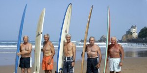 Les Tontons surfeurs posent sur la plage de la Côte des Basques- 27 juillet 2007- Biarritz. © JEAN-PIERRE MULLER AFP