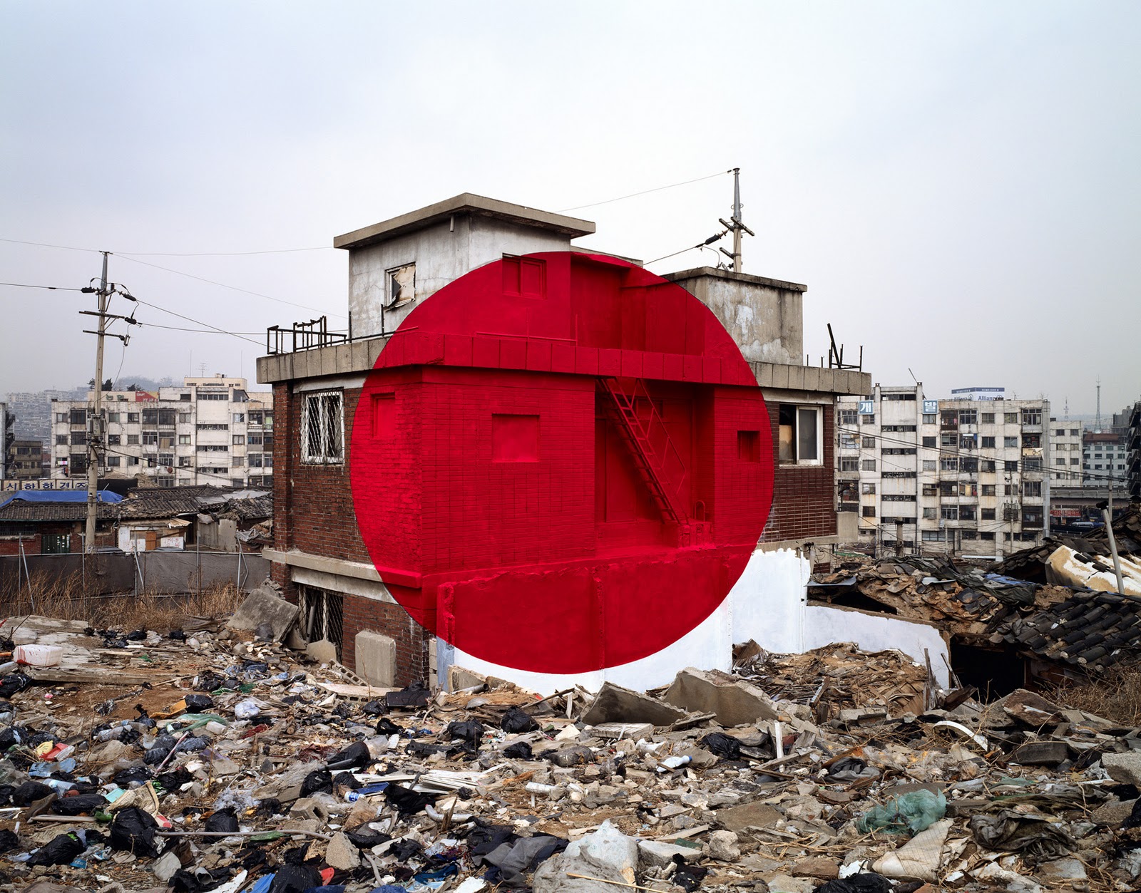 Les personnages sont comme situés derrière un quatrième plan qui sépare cette réalité artistique d’un reste. Or, ce reste est précisément là où nous sommes, nous spectateurs. A notre regard la fiction rejoint la réalité, puisque l’espace s’ouvre à nous, il n’est pas caché derrière des figures qui nous feraient face. Elle la rejoint aussi par le fait que l’instant est proprement mis en scène: l’écart est comme organisé, même si cette organisation est latente : c’est la construction de la ruine positive du collectif. Dans la version [portrait] le recadrage vertical isole la ligne de dos, en réduisant le champ de l’image. Devant cette ruine, nous comme reste de l’oeuvre pouvons imaginer la salvation qui peut venir avec ces territoires et ces actions.