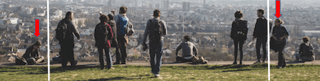 Or, que voit-on dans l’image, de Florence Joubert, choisie pour résumer (à contre-courant du travail de narration du sentier du Grand Paris) Paris? Précisément la photographie d’un groupe constitué par une pause, et qui se fige devant le panorama. On y voit les participants du groupe disséminés sur une butte certains arrêtés, d’autres assis ou en mouvement, et les écarts entre eux. Un fait cependant importe plus encore : le fait que les membres soient tous de dos (dans l’édition [portrait], dans l’édition [paysage] une personne sur la gauche tourne le dos au paysage, alors que sur la droite une autre personne marche parallèlement au panorama). C’est qu’on ne peut pas photographier le regard qui advient alors pour chacun. Deux personnes photographient une vue hors champ sur la gauche de l’image. C’est également l’assomption de cette photographie comme mise en scène.