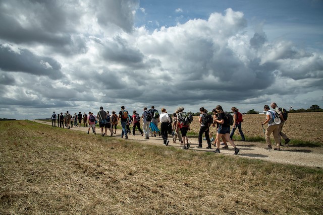 Activité grégaire, les processionnaires composent une communauté menée par un ou des guides. Les images illustrant les marches montrent des chenilles humaines s’effilant de dos dans le paysage. Les pauses/poses donnant lieu parfois à des illustrations dont la référence religieuse n’est pas exempte.