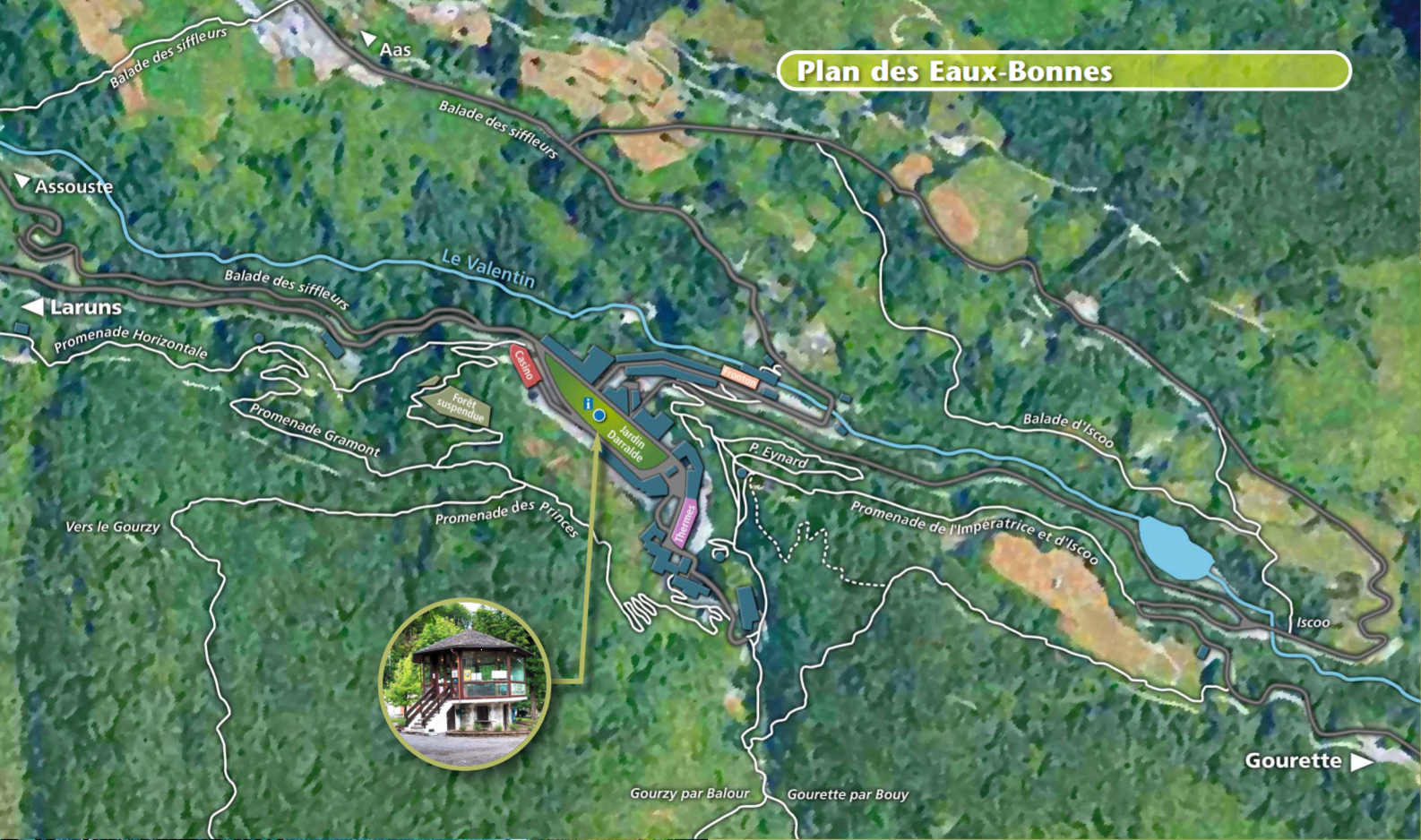 Cette description donne une idée de la situation. Quand on visite les Eaux-Bonnes aujourd’hui, on l’imagine mal sans son casino, le Jardin Anglais aménagé et arboré, et l’Hôtel des Princes tels que nous le découvrons, même si ce dernier est actuellement en attente de réhabilitation.