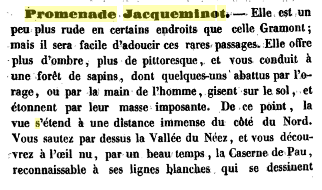Ainsi, lorsque Delacroix s’installe, les aménagements publics sont sommaires, comme en témoigne Adolphe Moreau dans Itinéraire de Pau aux Eaux-Bonnes et aux Eaux-Chaudes édité par Vignancour à Pau en 1841 :